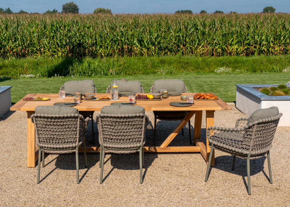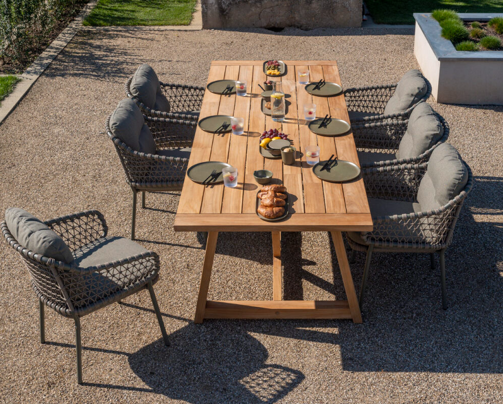 Стулья JURA, входящие в комплект, гармонично дополняют стол NOAH Teak. Их основание выполнено из алюминия оливкового цвета, что придает им современный вид. Спинка и сиденье стульев выполнены из всепогодного шнура бежевого цвета, который образует ажурное плетение. Подушки, выполненные в тон плетению, обеспечивают дополнительный комфорт. Глубокая посадка, наклон спинки и округлые подлокотники делают эти стулья максимально удобными для длительного использования.