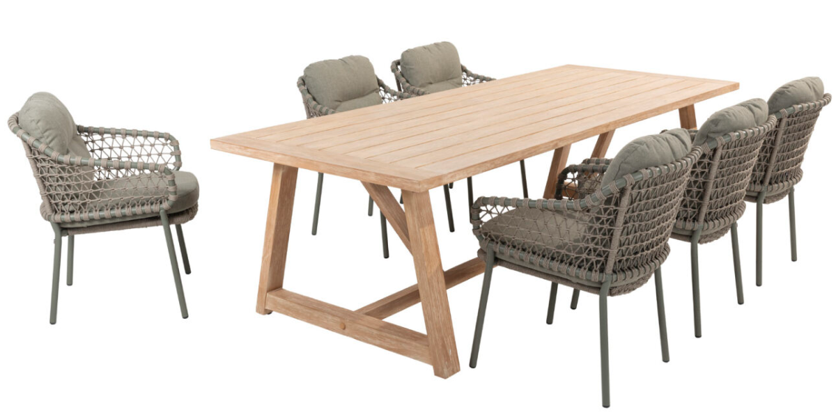 Все элементы комплекта выполнены из высококачественных материалов. Тик, используемый в производстве, имеет сертификат SVLK/V-legal, что подтверждает его экологичность и долговечность. Натуральные масла, содержащиеся в тике, позволяют ему выдерживать различные погодные условия. Со временем, под воздействием окружающей среды, тик приобретает светло-серый оттенок, что придает мебели естественный и благородный вид.