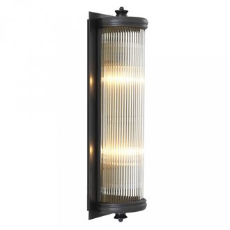 Изысканный настенный светильник, выполненный из прозрачного стекла, железа и латуни с отделкой под черную бронзу. Светильник имеет 2 лампочки форматом Е27.